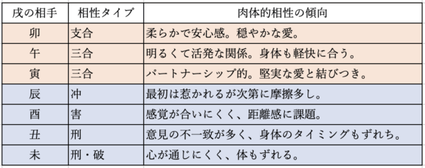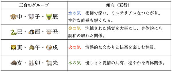 それぞれの組は恋愛・肉体関係においても相性良好とされます。