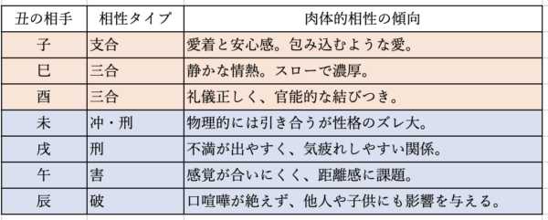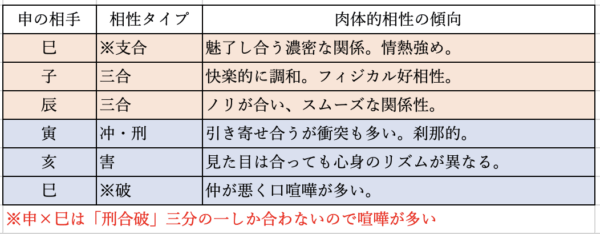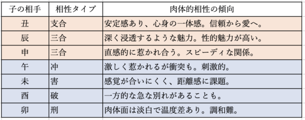 四柱推命で生れ日〈支〉を観た時の男女の肉体的【身】相性表