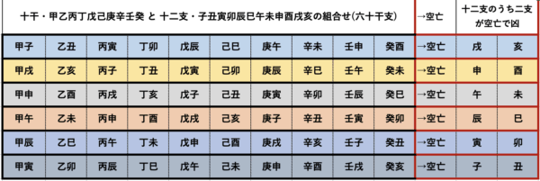 十干の人が「戌」と「亥」の二支が空亡となり、甲戌から始まる2行目以下も同様に右端の赤枠内の