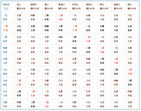 ・一白水星の人は本命星が東南に運行の年 ・二黒土星の人は本命星のが中央に運行の年