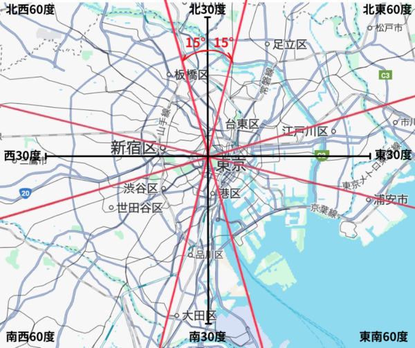 北西、北東、東南、南西は各60度の範囲で正しい九星気学の方位を見ます。